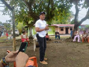 Frank David Mejía Jiménez, candidato a la curul de paz de la Cámara de Representantes, durante el lanzamiento de su candidatura en el corregimiento de Puerto Bélgica, Cáceres.